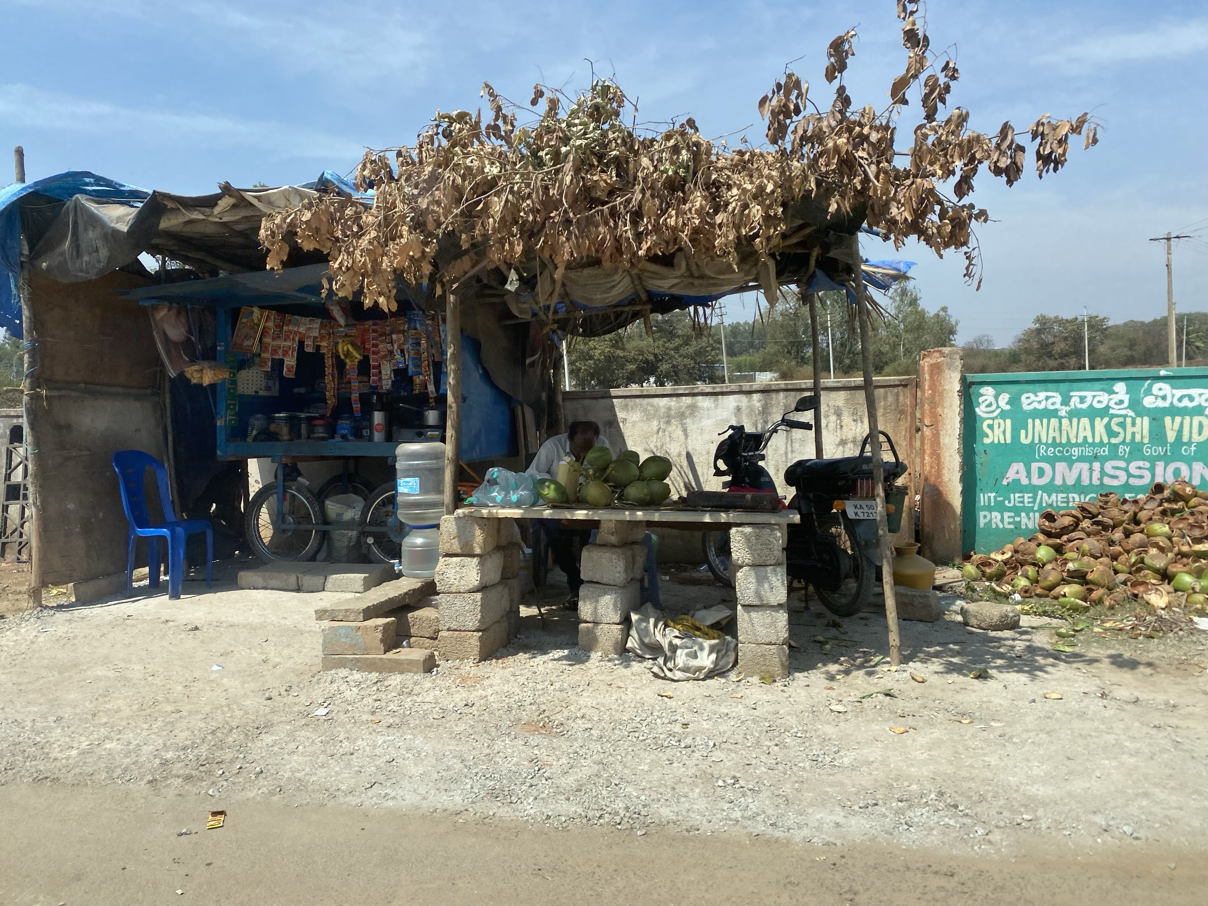 This afternoon we arrived in Mysore. The driving was very exciting. But from the beginning on: we had a good immigration in Bangalore yesterday. Then we bought a SIM card which should have been activated the next morning. When we went out of the airport building it smelled very tasty like Indian food. Then we went with the shuttle to our hotel for this night. When we arrived we only wanted to eat a bit and then go to bed but… when Henrik opened his luggage he saw that a bottle of beer got broken. So I got into bed and Henrik & Sarah cleaned some stuff which was full of beer. I was lucky that I wasn’t lying between all the beer. We slept very good and in the morning we had a nice breakfast: indian food, omelette and toast. Afterwards we went back to the airport with the same taxi driver as the evening before. We went to the counter where we got the SIM card because it didn’t activate. We got the money back. Then we went by bus 4 hours to Mysore. The traffic here is very chaotic. The bus driver was honking the whole time. But if you don’t drive like everyone else does, then you are screwed. During a little break Sarah & Henrik had a coconut. Finally we arrived at the place from a friend of a friend of us where we can sleep. We bought some stuff, ate very delicious and now are lying in the bed. We think that here aren’t so many European guys because some people look after us and ask where we come from. Tomorrow we’ll be in a hotel, which our friend organized for us, then we will stay here 3 more days and on Monday we will visit a Jungle lodge for 4 days. We’re looking forward to everything. good night!